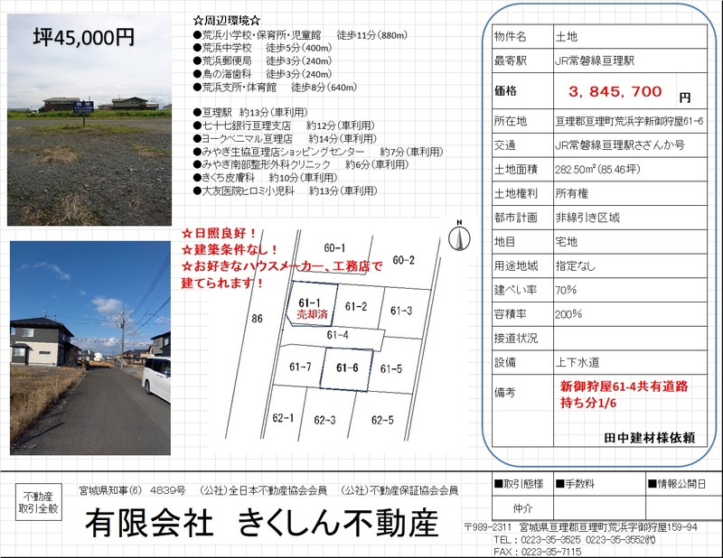 亘理郡亘理町荒浜字鳥の海(亘理駅)住宅用地物件画像数4周辺画像数0動画数0181万円坪単価:3.51万円/坪土地面積170.95㎡坪数51.71坪私道負担面積土地権利所有権引渡条件現況渡し最適用途住宅用地建ぺい率70%容積率200%所在地亘理郡亘理町荒浜字鳥の海交通JR常磐線(いわき~仙台) 亘理駅 徒歩60分不動産会社:(有)きくしん不動産 亘理、荒浜、鳥の海地域に強い不動産!詳細を見るとりあえず保存お問合せ(無料)