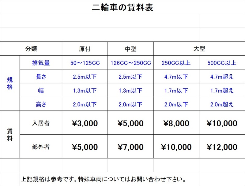 料金表(バイク置き場)
